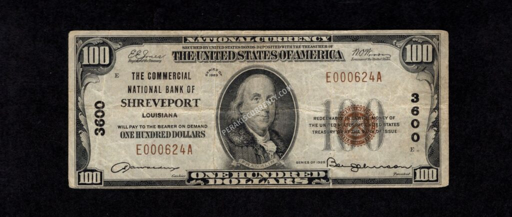 Margins all around on this evenly circulated high denomination from this Shreveport bank in Caddo County.