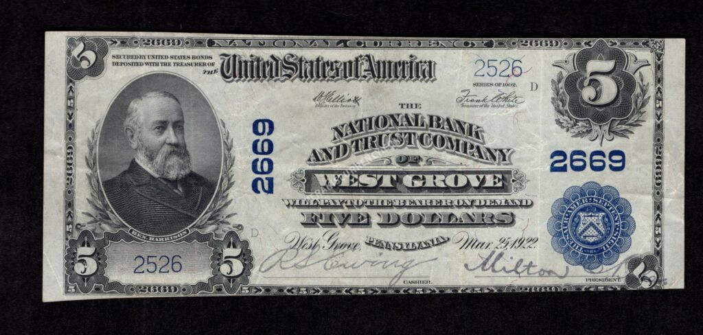 A bright Very Fine on the second title of this bank in Chester County with only Nine large and 40 small size notes recorded. Clear signatures of the bank’s officers.