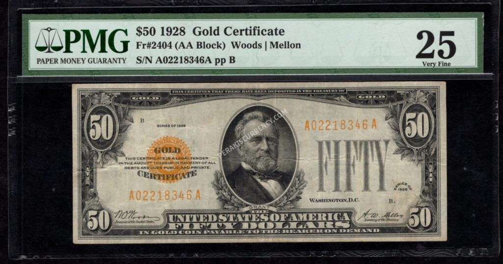 | 2404 | $50 | Gold Certificate | 1928 | PMG 25 | $1285 |